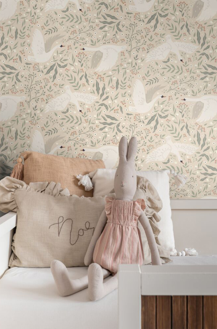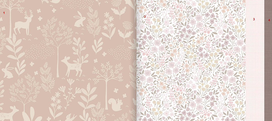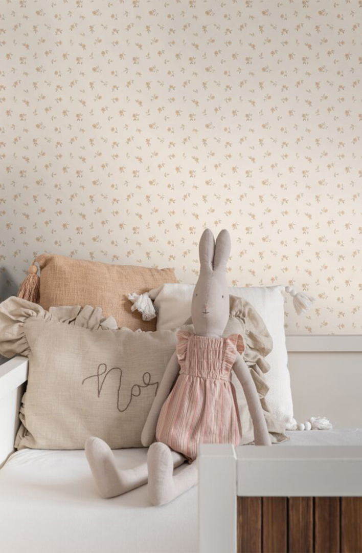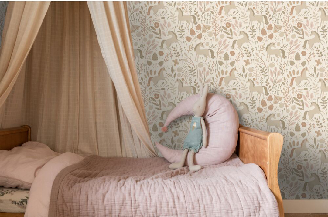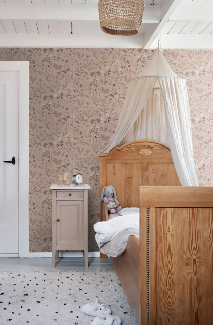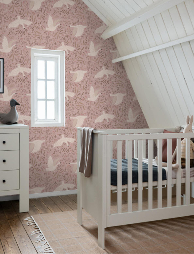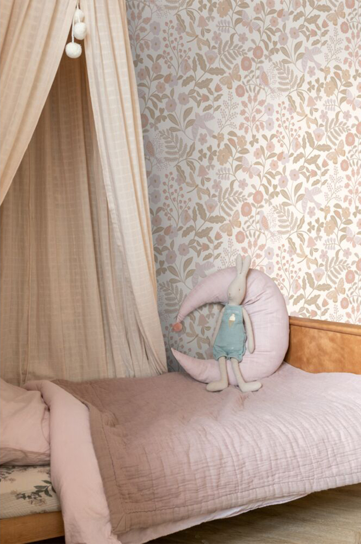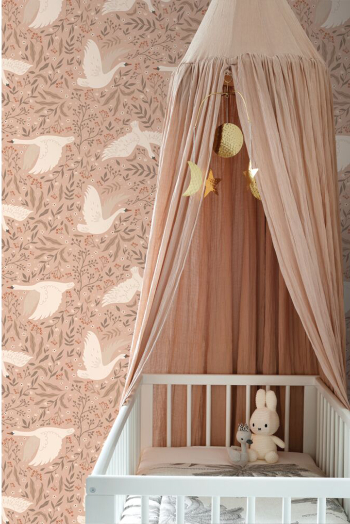 Όμορφες βρεφικές ταπετσαρίες που συνδυάζονται με κομποζέ ρομαντικά υφάσματα για ένα μοναδικό βρεφικό δωμάτιο.
