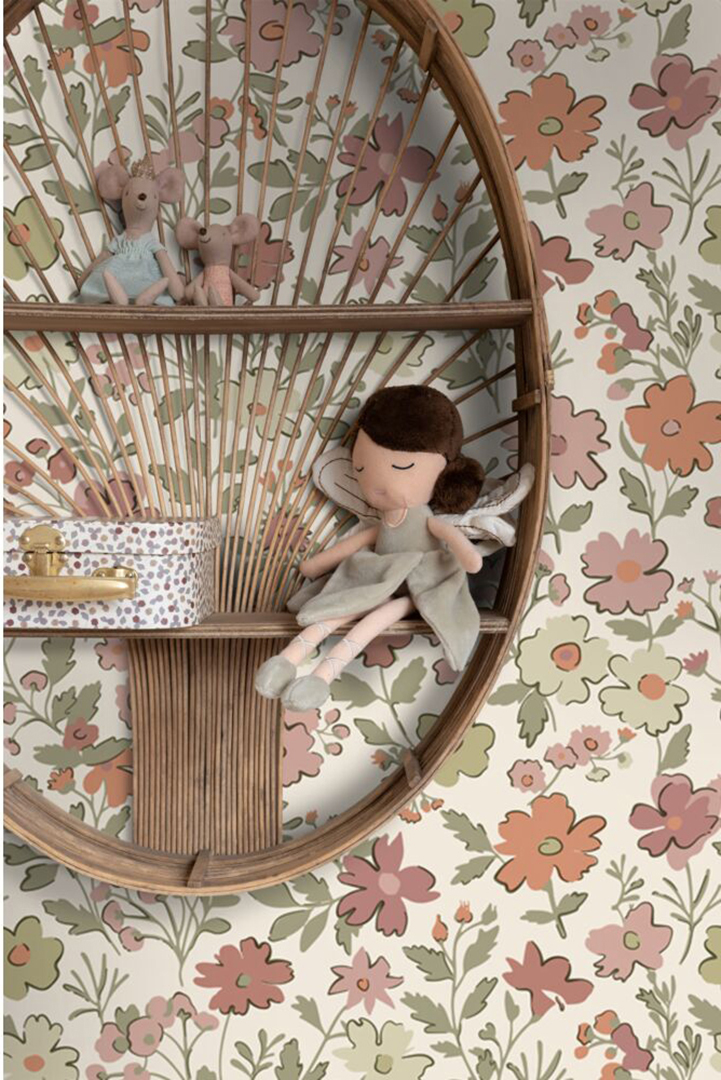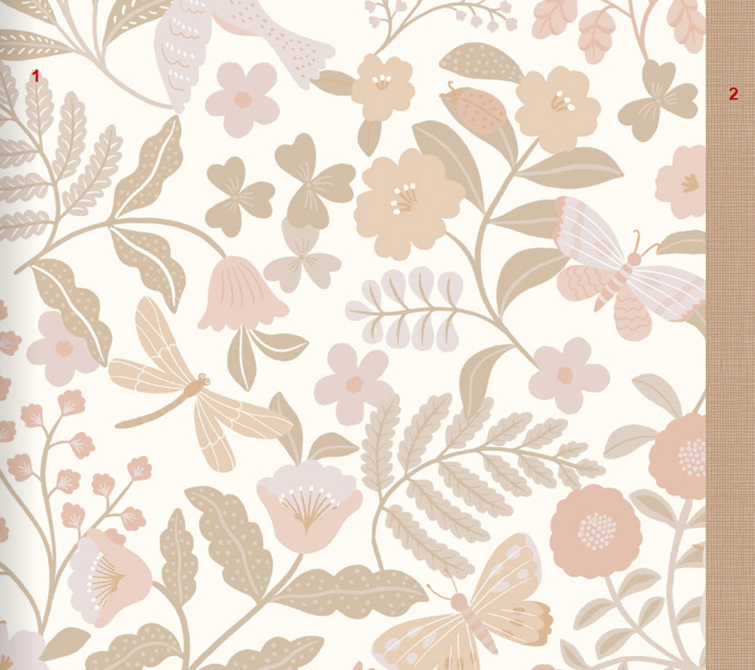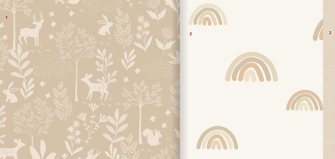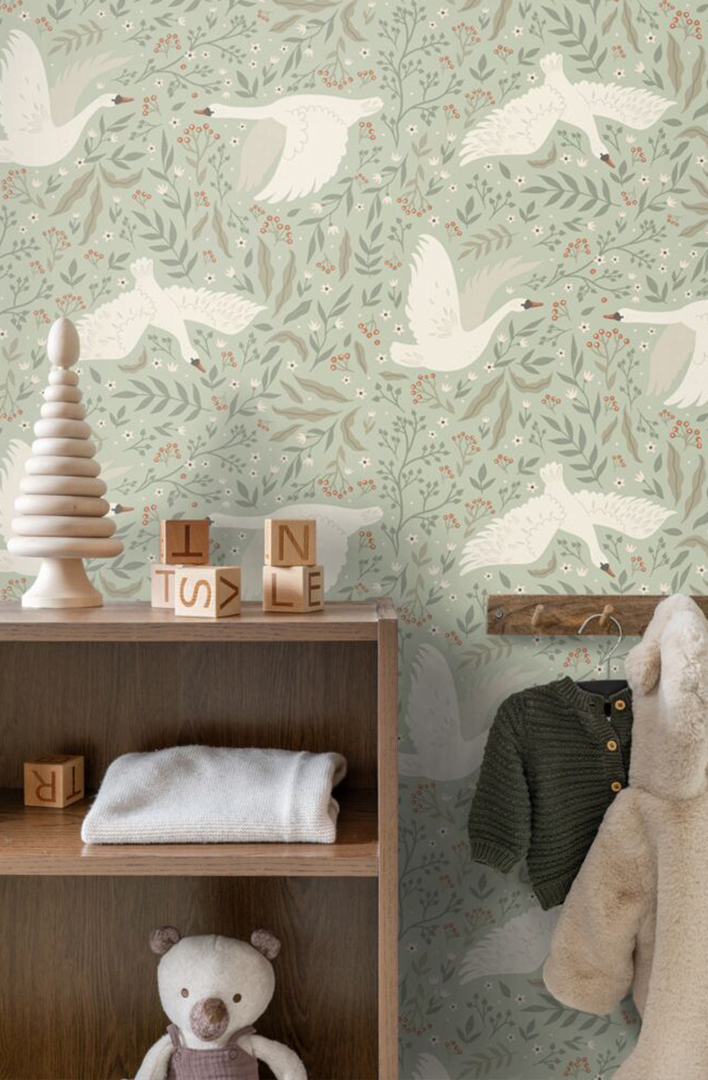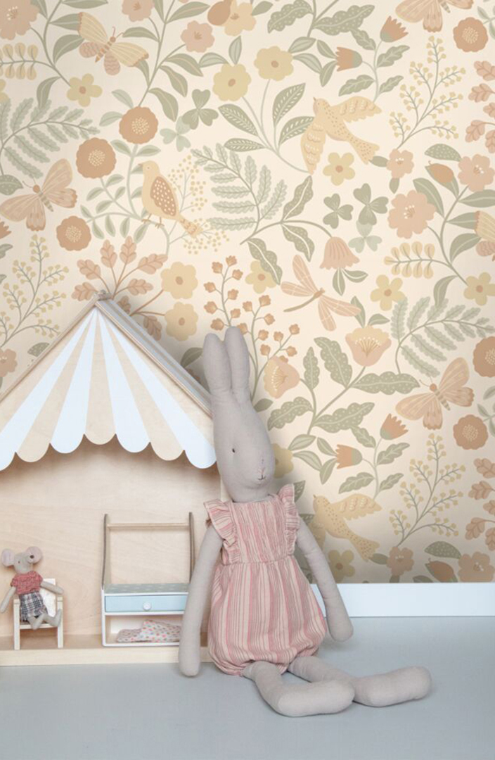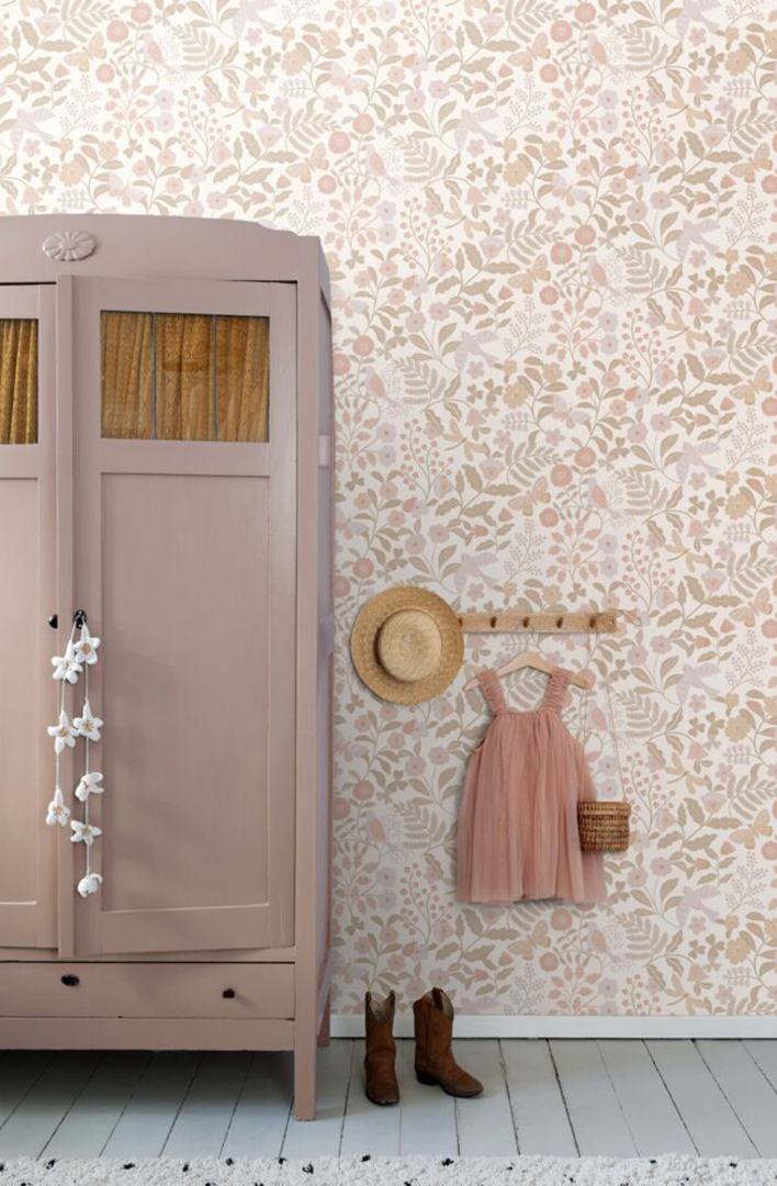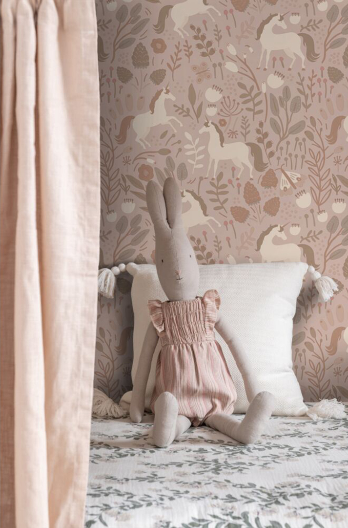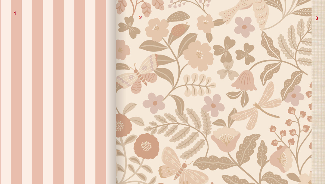 Όμορφες βρεφικές ταπετσαρίες που συνδυάζονται με κομποζέ ρομαντικά υφάσματα για ένα μοναδικό βρεφικό δωμάτιο.
