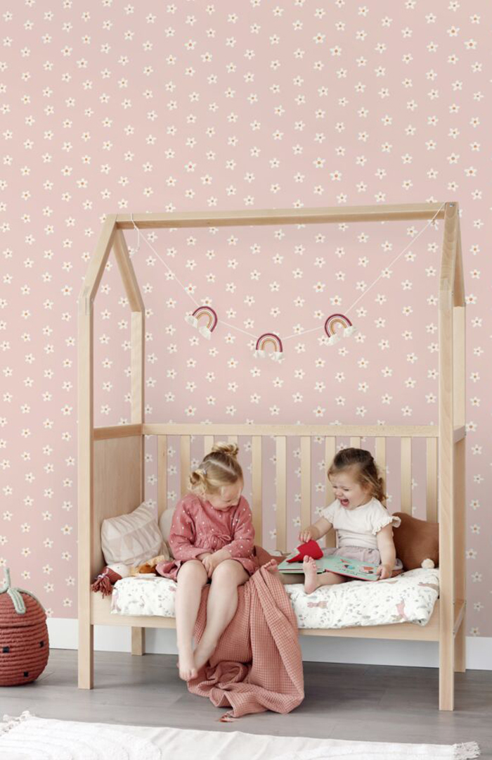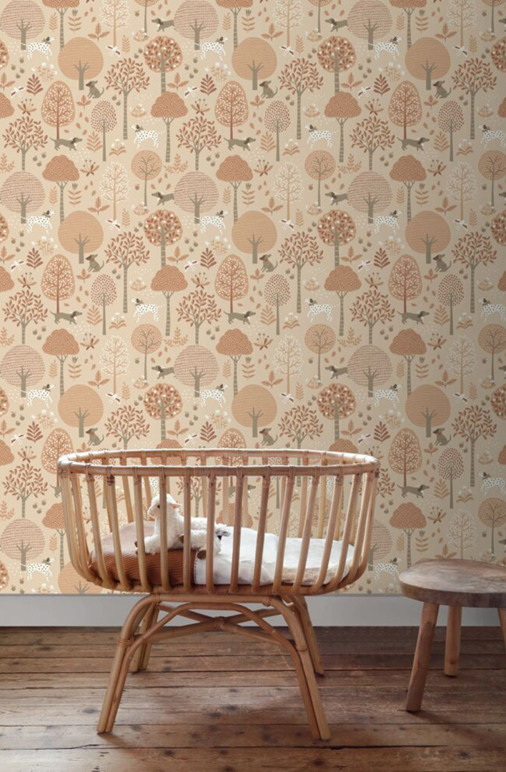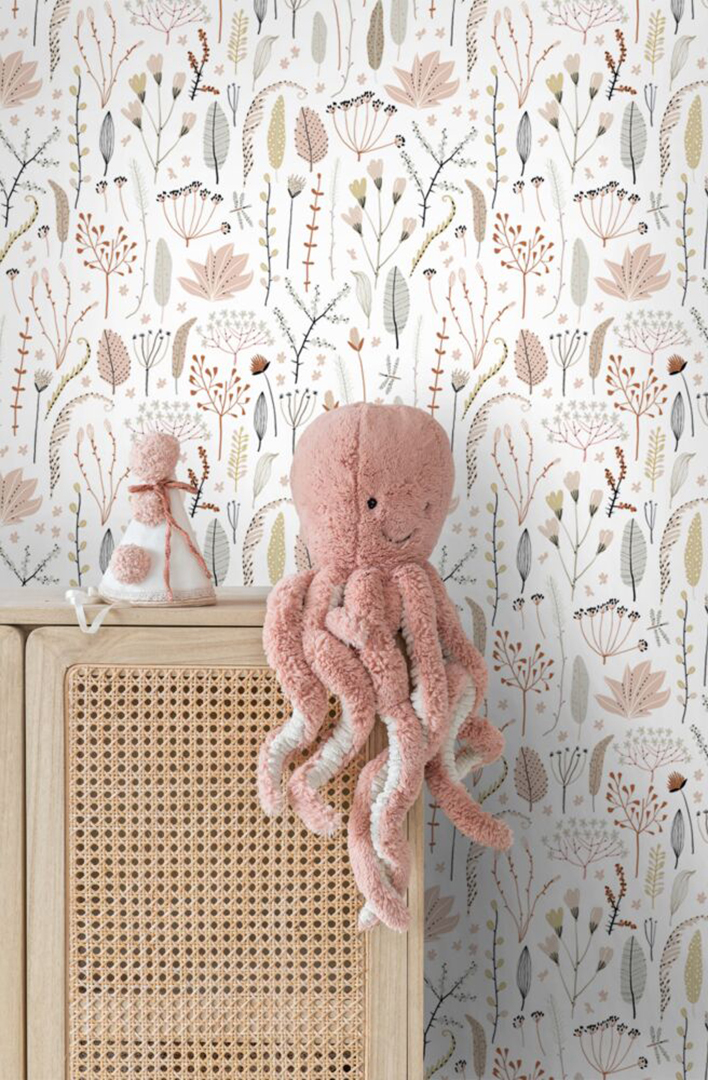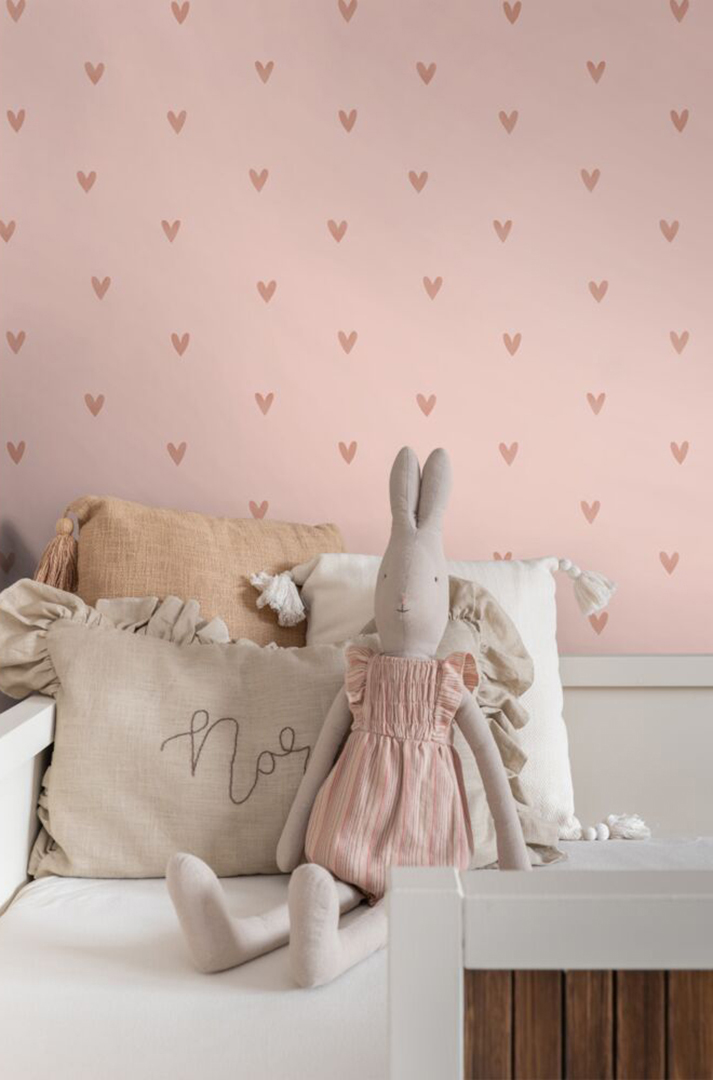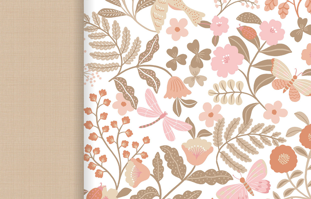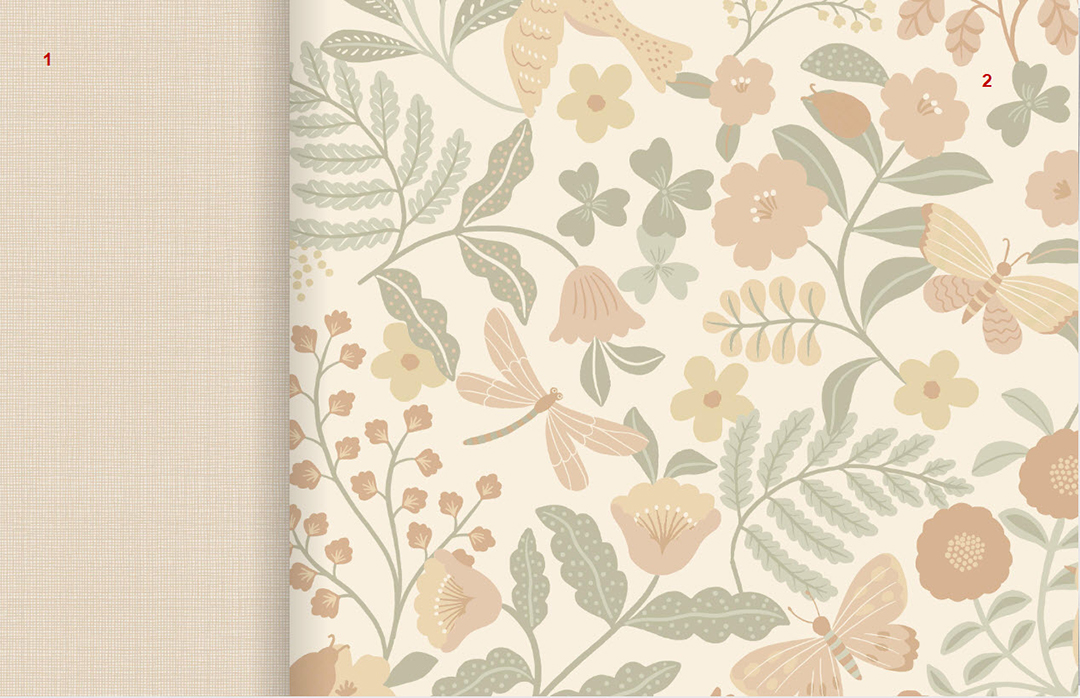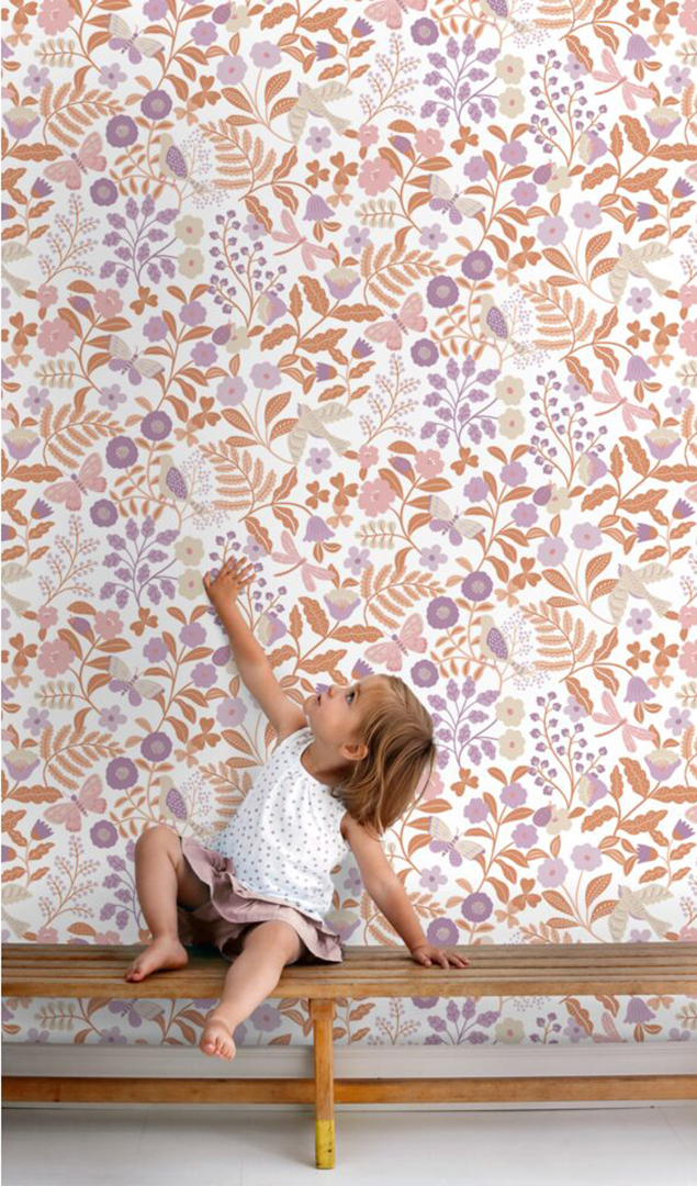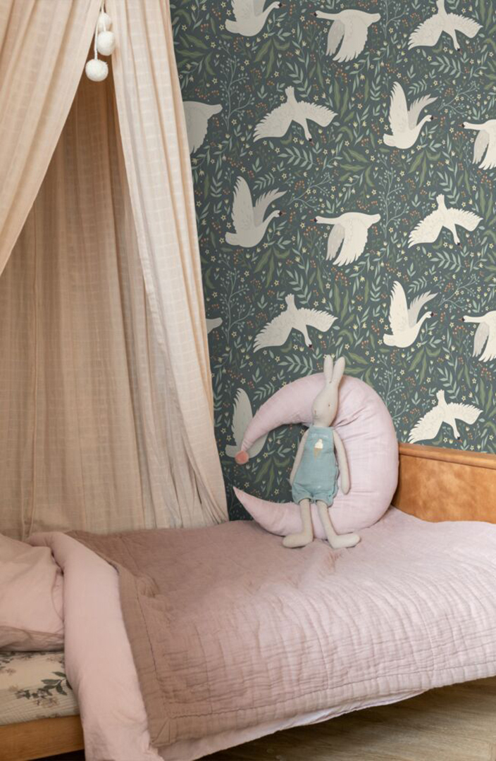 Όμορφες βρεφικές ταπετσαρίες που συνδυάζονται με κομποζέ ρομαντικά υφάσματα για ένα μοναδικό βρεφικό δωμάτιο.